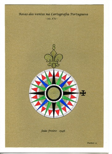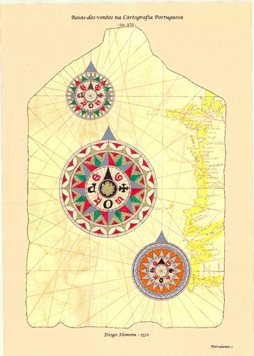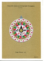 Deste último, elaborei seis Rosas-dos-Ventos das estampas 1, 2 e 6 bem como o mapa de Portugal da estampa 2 e montei dois portulanos que apresento em seguida. A forma dos portulanos pretende imitar a da pele de cabra curtida (pergaminho) que era usada a bordo para a elaboração do desenho das costas que se iam avistando.